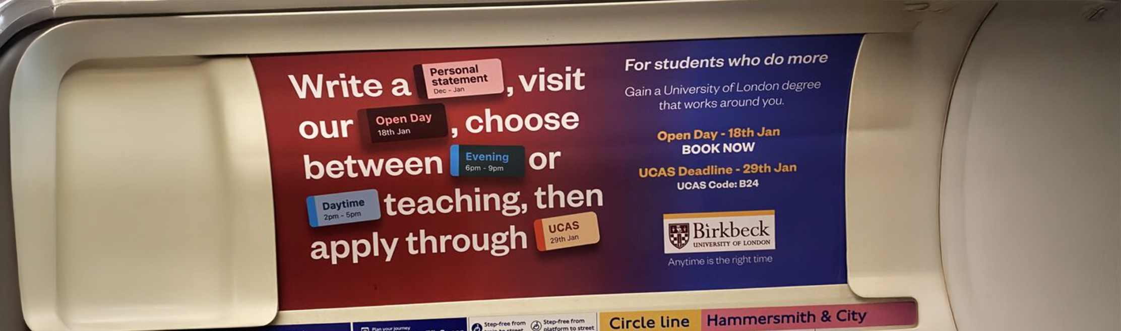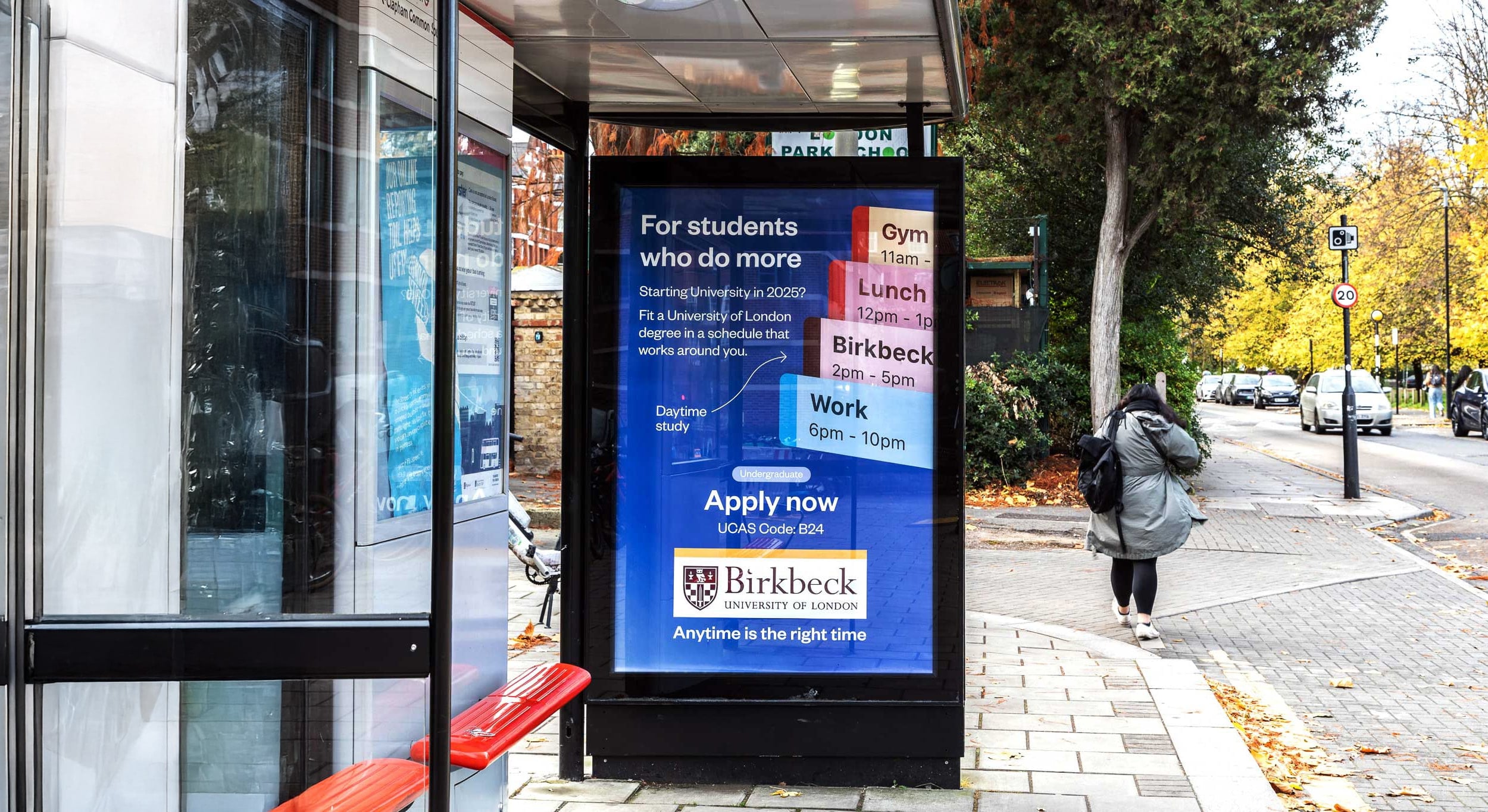 To lead the visual design of a multi-format Out-of-Home (OOH) campaign for Birkbeck, University of London. The primary objective was to translate the university’s unique value proposition—flexible degrees for working professionals—into a high-impact, instantly understandable visual system that could form the foundation for a broader multi-channel campaign.