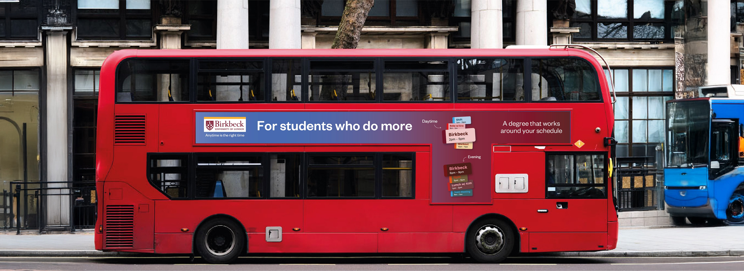 I designed and implemented a strategic colour-coding system that was central to the campaign’s messaging. A vibrant, optimistic blue was assigned to represent daytime study, while a deep, focused burgundy signified evening sessions. This simple yet powerful visual metaphor immediately communicated the campaign’s core promise of flexibility without relying on body copy, creating a cohesive and memorable thread across all OOH assets.