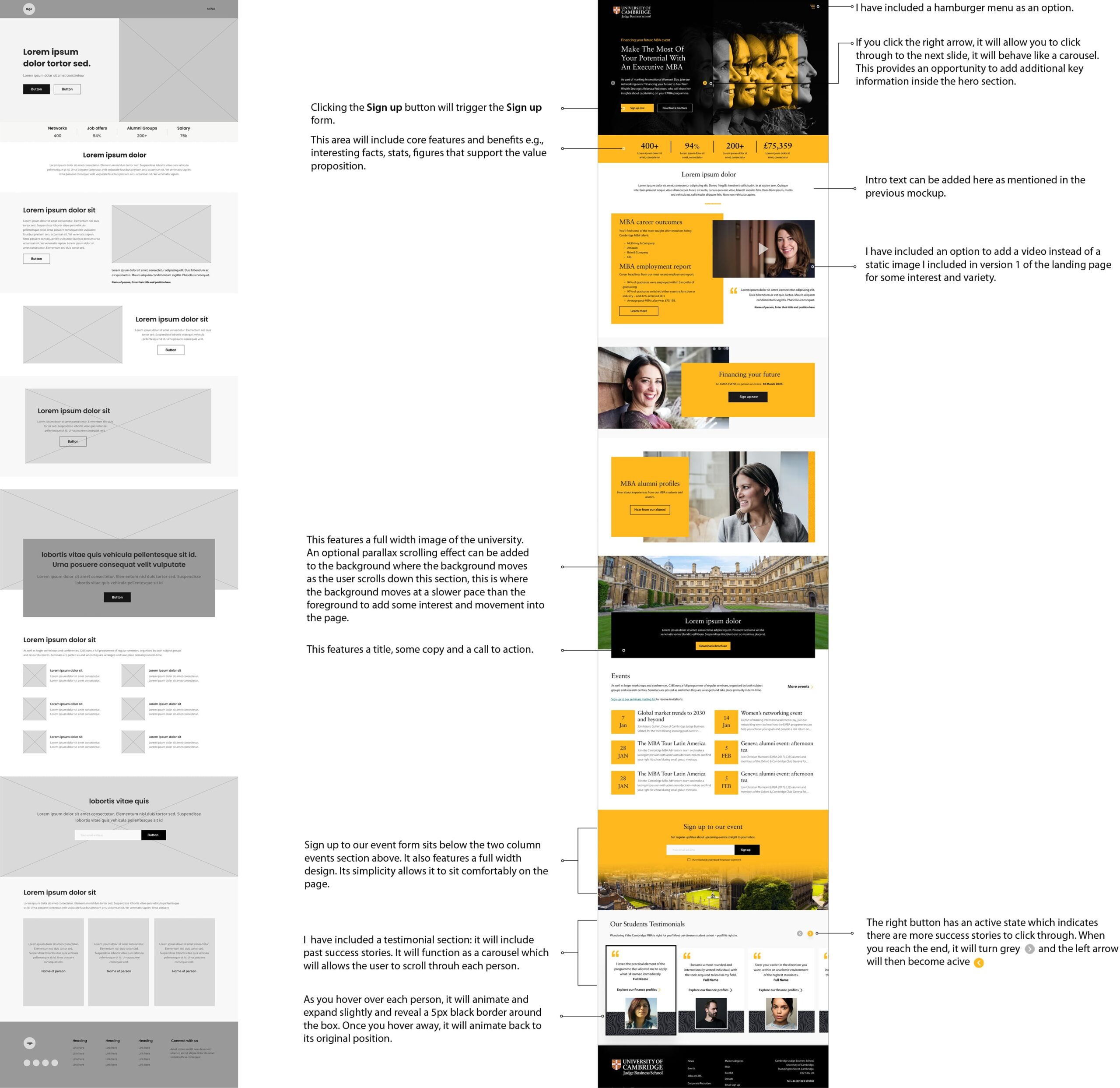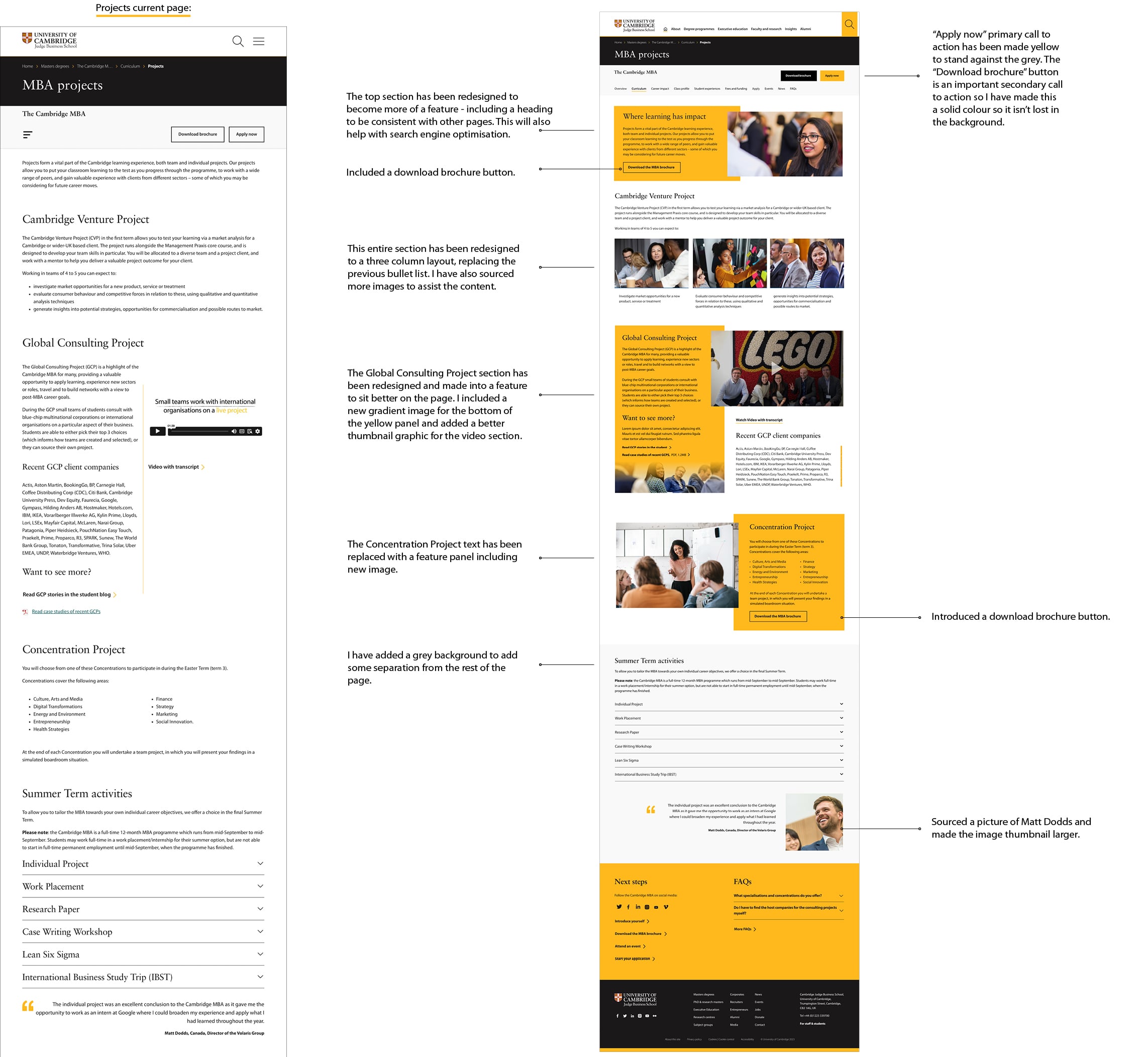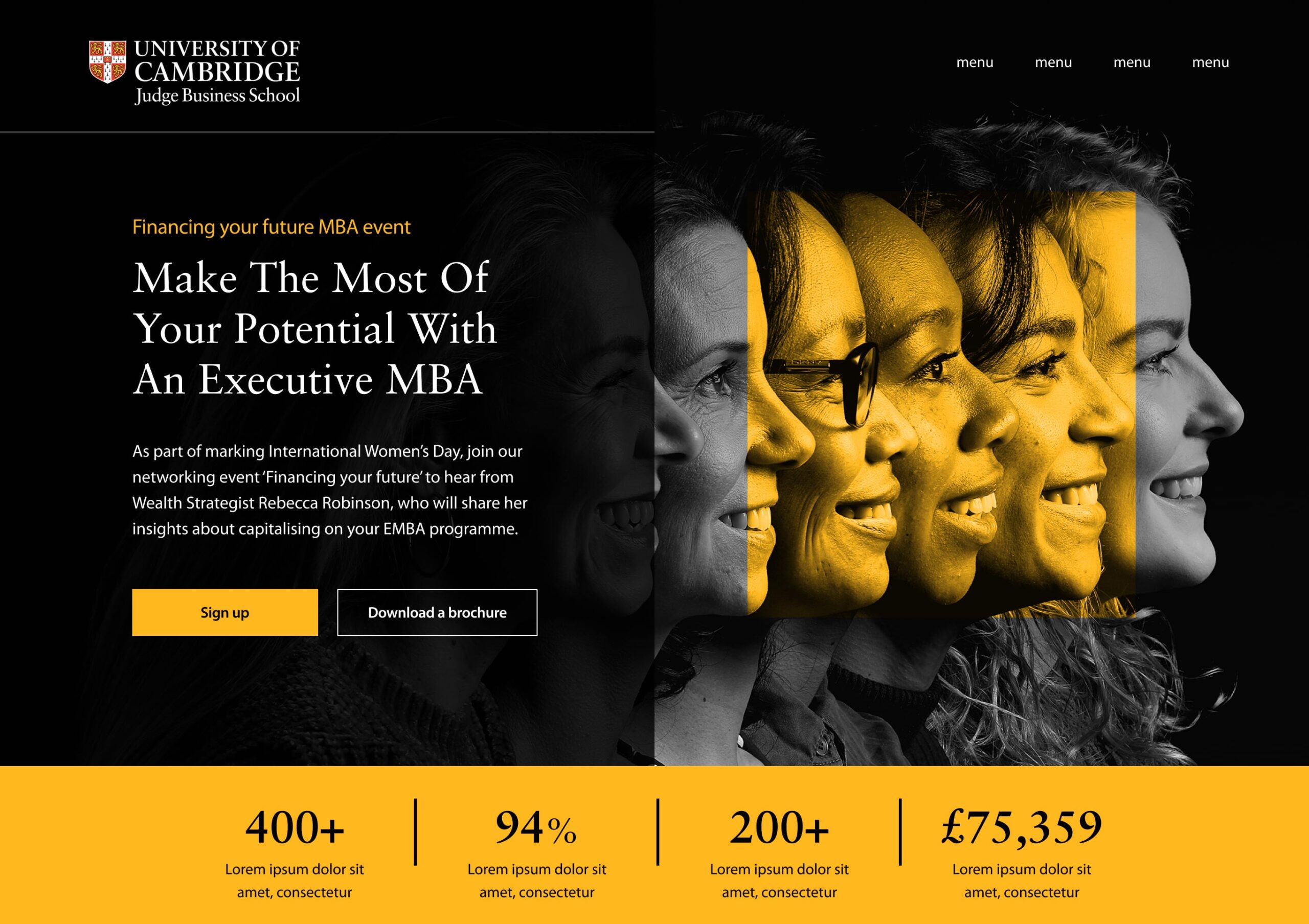 I made design enhancements to 15 webpages to really sell the Cambridge experience and to bring out the unique selling points of the university. This would include interesting stats and stories about the university that would encourage students to want to enrol on their business degree programmes. The challenge was to be bold and stand out whilst remianing on brand to really push the experience of the university.