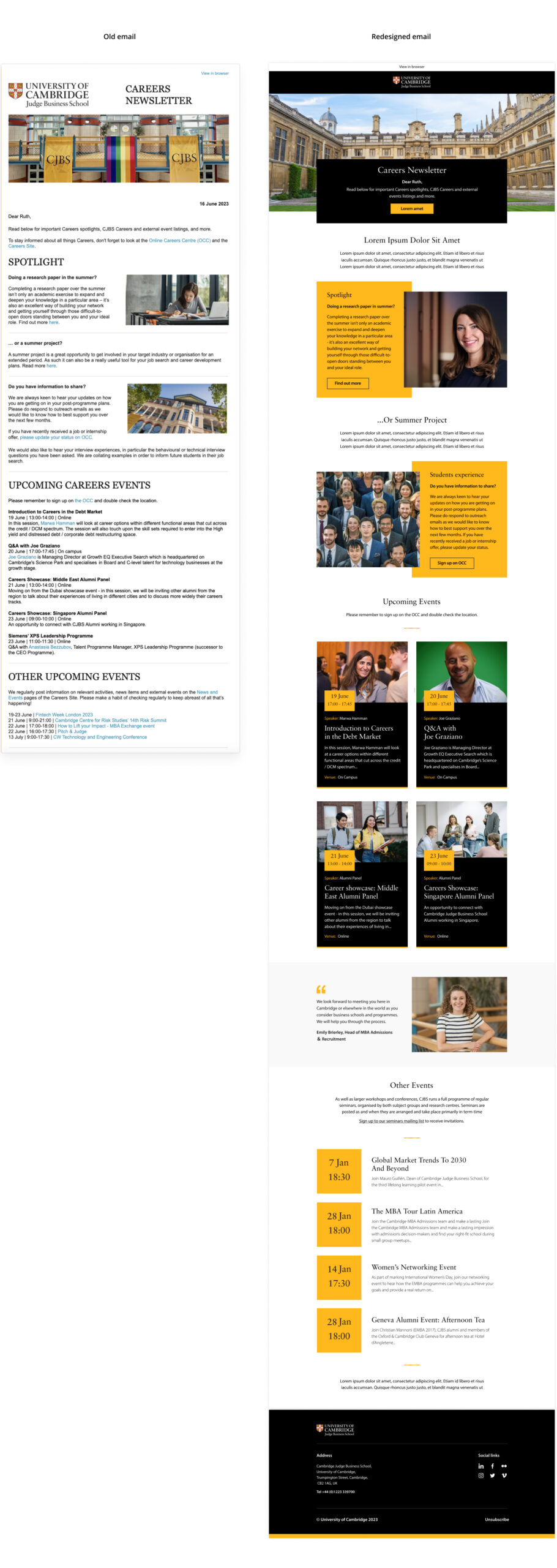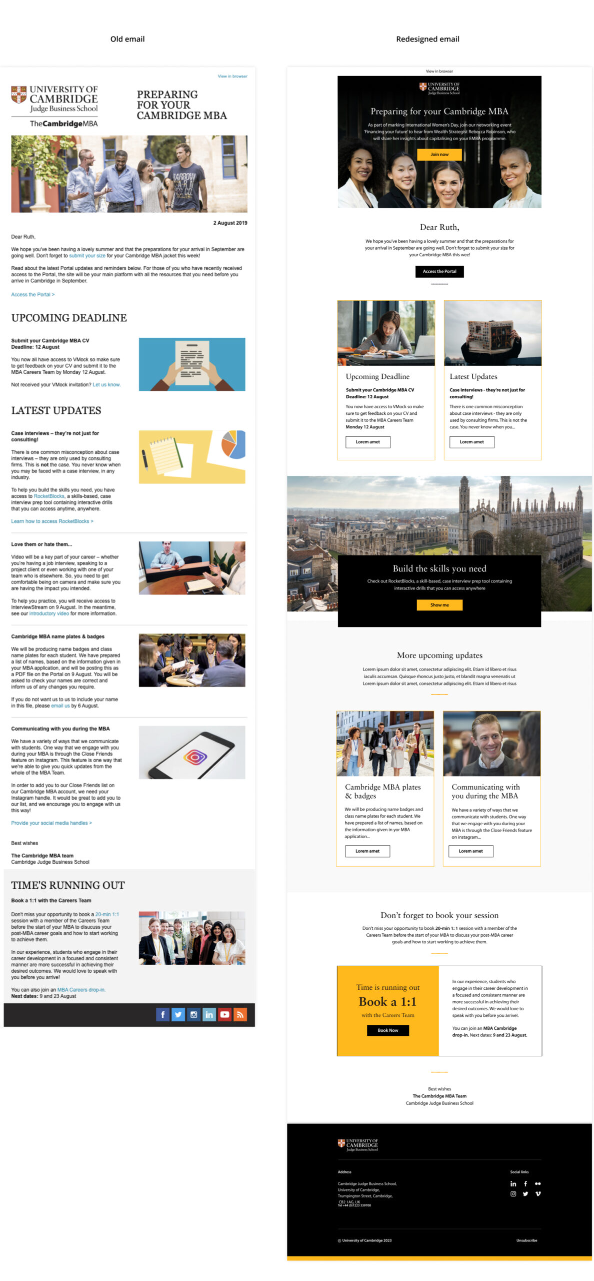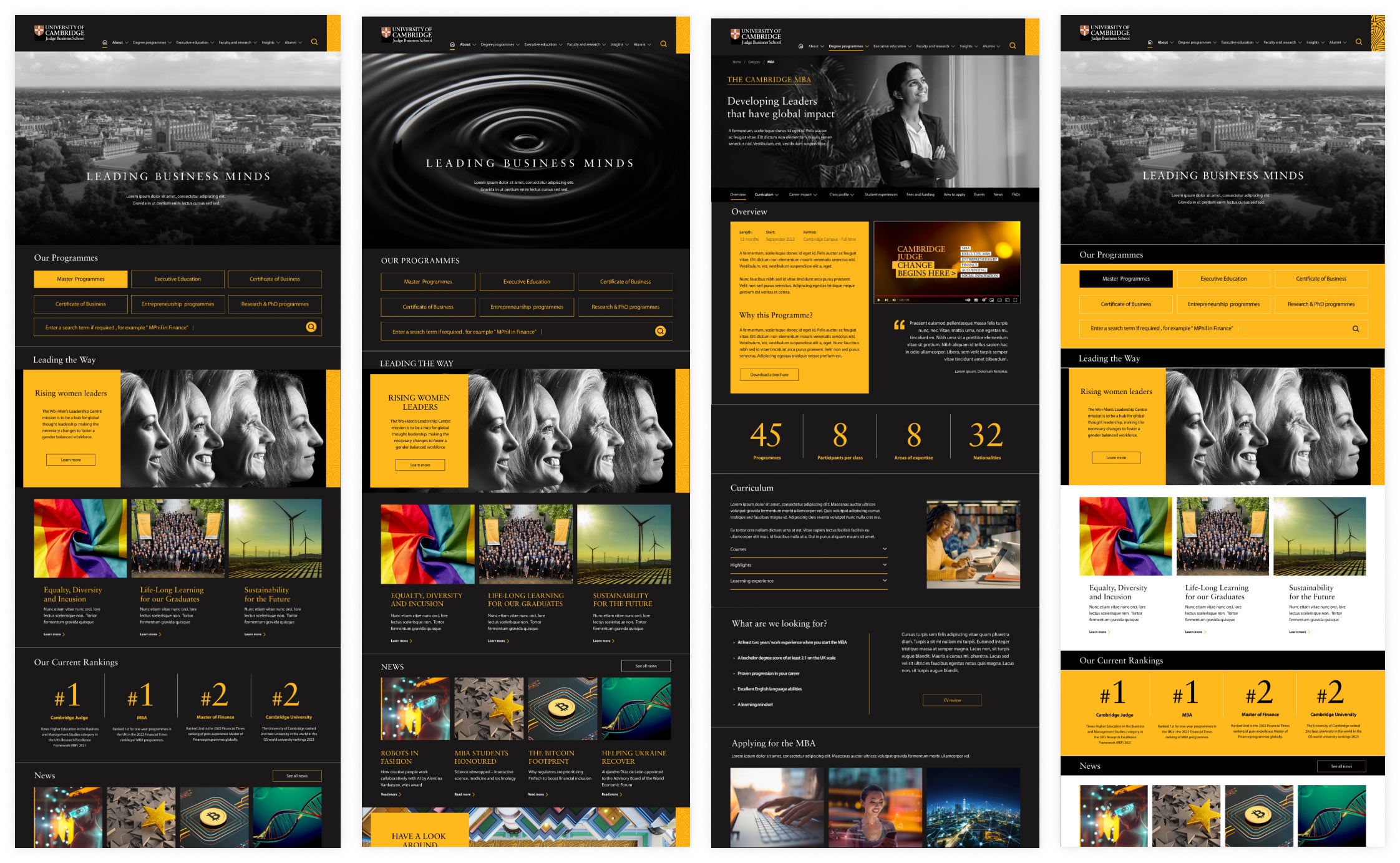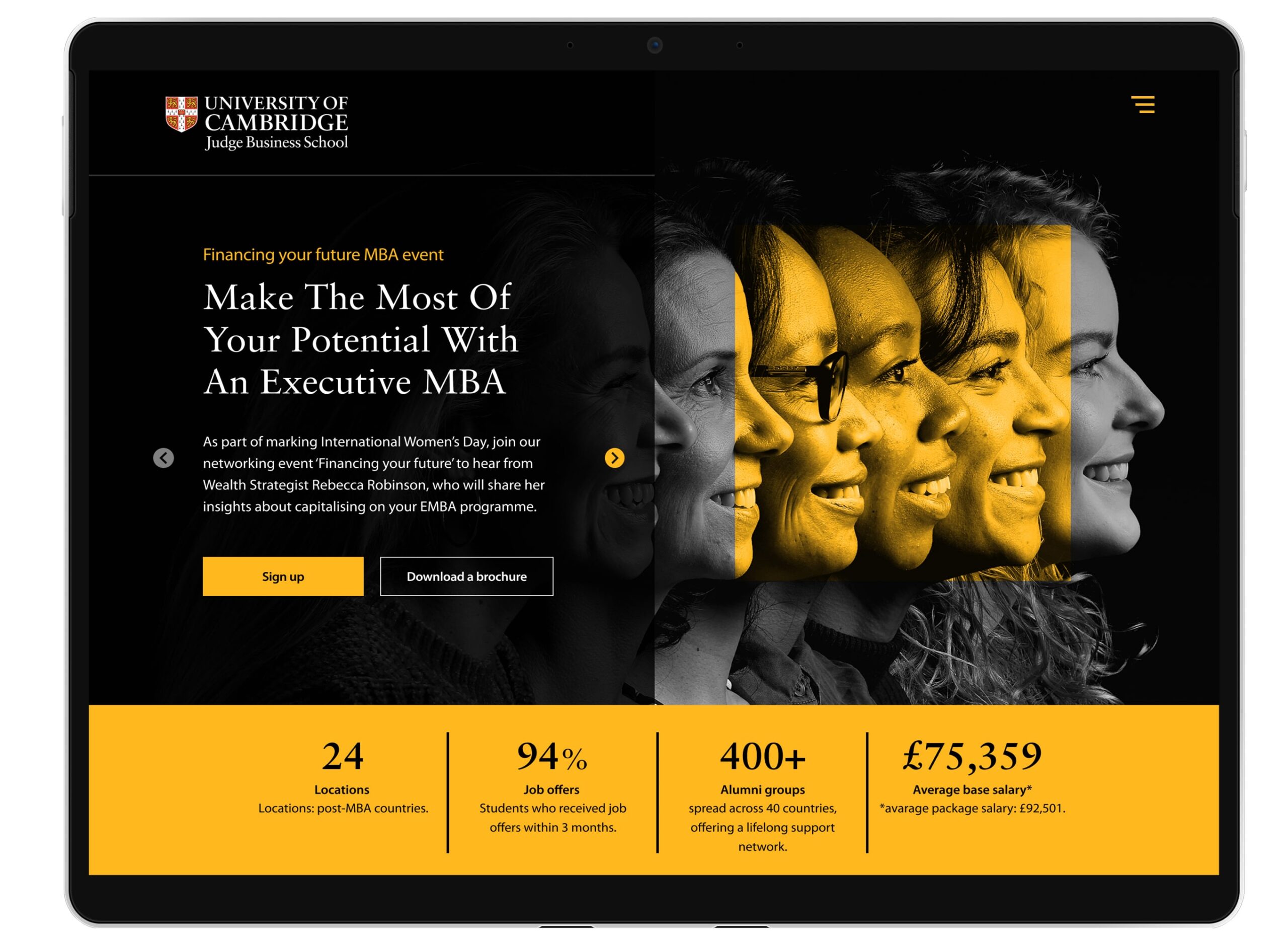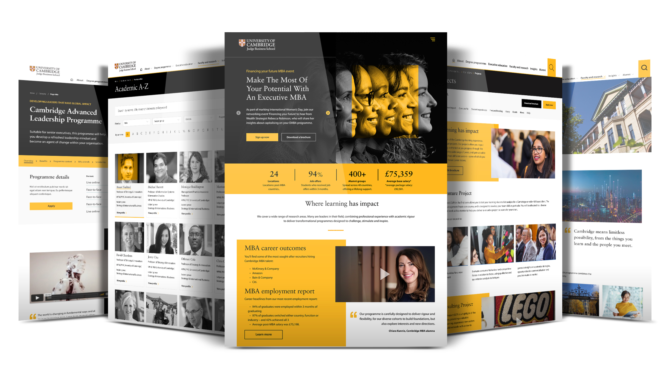 The business school of the University of Cambridge main objective was to appeal to future students by attracting them to their business degree programmes. This included a huge multi webpage redesign and enhancement, landing pages and email templates needed to be reviewed and uplifted to help improve conversion and enhance the customer journey.