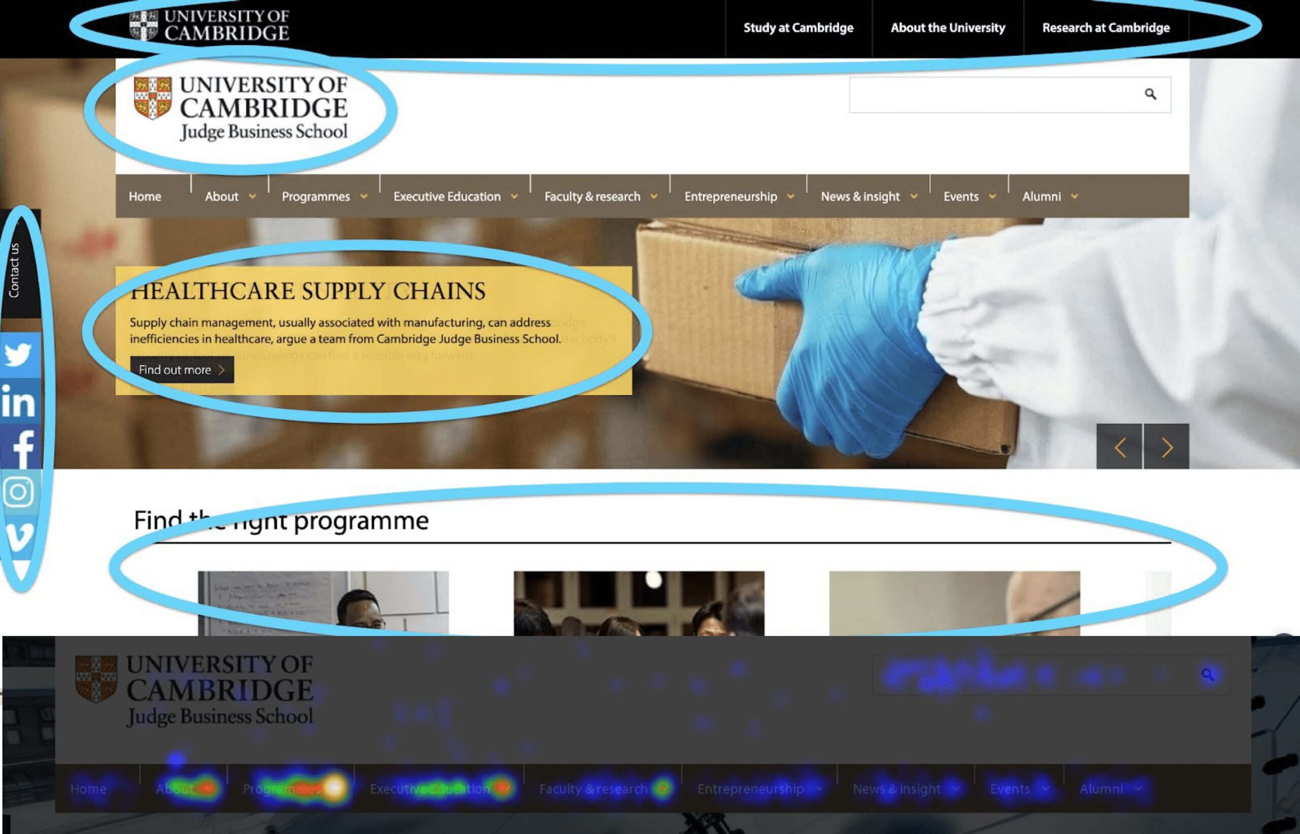The website was very outdated in its appearance. The user interface and the general treatment of content and call-to-actions were not very good. The website did not reflect what potential customers would expect from a leading Business School. The Cambridge experience was being lost, it did not show it’s difference and identity as a leading business school. In addition to this, there were other universities, some I identified in the London area that had better ways of showcasing their uniqueness and identity as a university. You can see below where I have circled some of the problem areas. Their were issues with their current navigation design. The page appears very busy and underwhelming at the same time. The page hierarchy was an area that also would need to be improved so potential students and customers know where to go intuitively to find important information. There is no clear hierarchy and page structure.